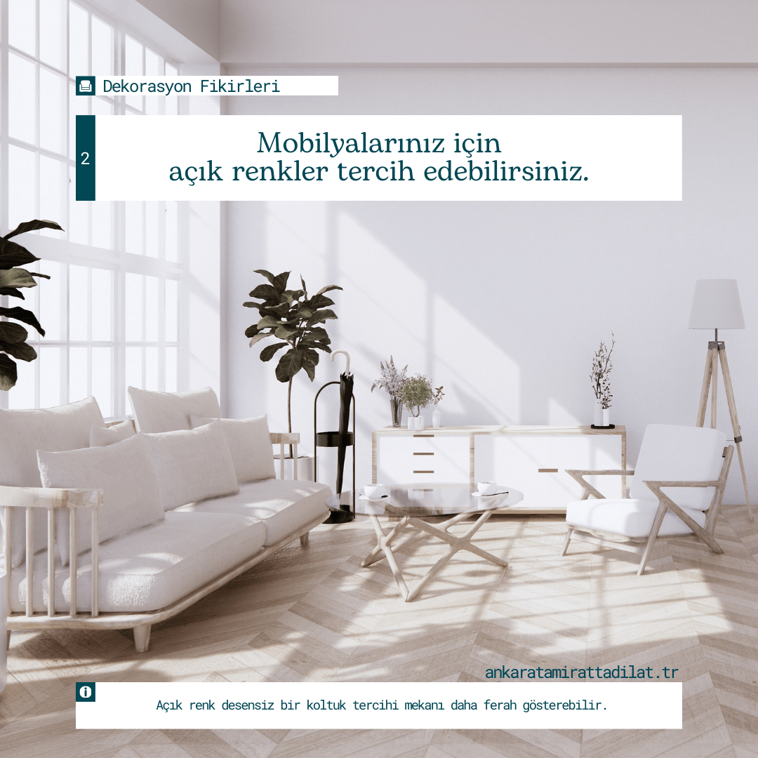 Ev dekorasyonunda renk seçimi, yaşam alanının enerjisini doğrudan etkileyen en önemli unsurlardan biridir. Ankara’da genellikle gri, bej, krem ve pastel tonlar yoğun şekilde tercih edilmektedir.Renk seçiminde dikkat edilmesi gereken bazı noktalar şunlardır:Küçük alanları geniş göstermek için açık re